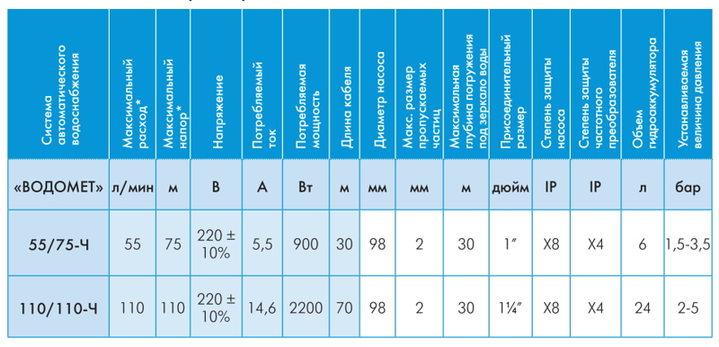 Система автоматического водоснабжения ВОДОМЕТ 55/75-Ч предназначена для подачи чистой воды из скважин (с внутренним диаметром от 110 мм и более), колодцев, резервуаров и открытых водоемов, для обеспечения бесперебойного водоснабжения в автоматическом режиме коттеджей, дач и ферм.