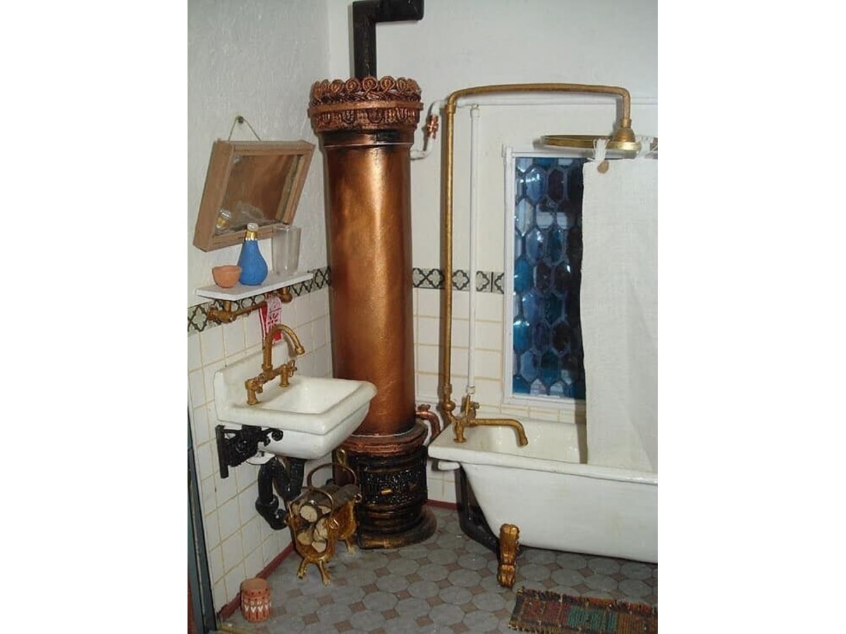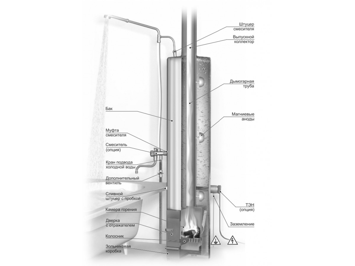 Топка расположена в нижней части водонагревателя и состоит из двух камер, разделенных колосниковой решеткой: топливника и расположенного под ним зольника. Дверцы топливника и зольника находятся на боковой стороне топки. Топка может быть выполнена из стали или чугуна. Над топкой располагается бак в виде вертикального цилиндра, через ось которого проходит дымоходная труба от топки. Сверху к дымоходной трубе подсоединяется дымоход, который отводит наружу продукты сжигания древесины. Бак, как правило, изготовлен из стали либо из нержавеющей стали и имеет емкость около 80-100 литров.