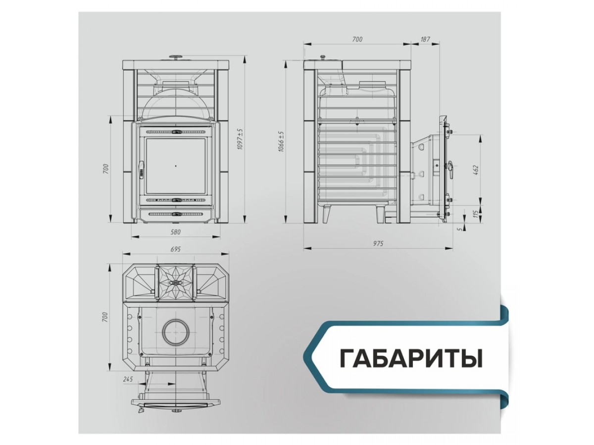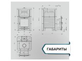 Дрова длиной до 70 см легко помещаются внутрь топки объемом 61 литр. Диаметр дымохода — 150 мм внутренний, 170 мм внешний, что обеспечивает эффективный дымоудаление и оптимальный тяговый режим.