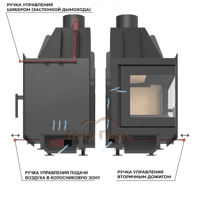 Регулирование тяги возможно с использованием шибера, встроенного в патрубок дымохода диаметром 200 мм. Ручка управления шибером размещается на передней поверхности топки, справа вверху.