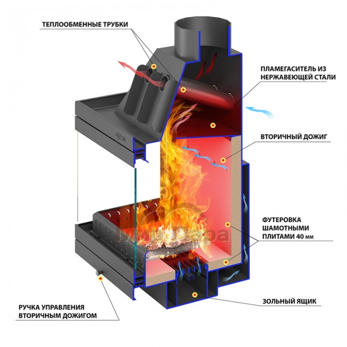 Трубы, размещённые над топочной камерой в области дымосборника, увеличивают скорость движения нагретого воздуха и усиливают конвекционные возможности каминной топки АСТОН 700 L. Пламя и дымовые газы, догорая, огибают пламегаситель в верхней части топочной камеры в дымосборнике.