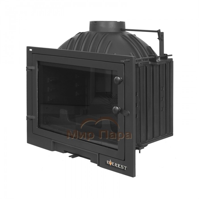 Дверь топочной камеры чугунная с панорамным стеклом. Через дверь такого размера удобно обслуживать топку, подкладывать дрова и наблюдать за горением топлива внутри. Между пространством топки и стеклом размещена съёмная защитная планка, которая предотвращает выпадение дров или угольков при открывании топки EVEREST D10.