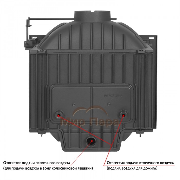 На задней стенке топочной камеры размещена дополнительная панель из чугуна, которая дополнительно защищает заднюю стенку от перегрева. В верхней части топки расположен чугунный пламегаситель, который позволяет получить максимальный эффект от сгорания дров. Дожиг дымовых газов проходит в дымосборнике, расположенном над топочной камерой.