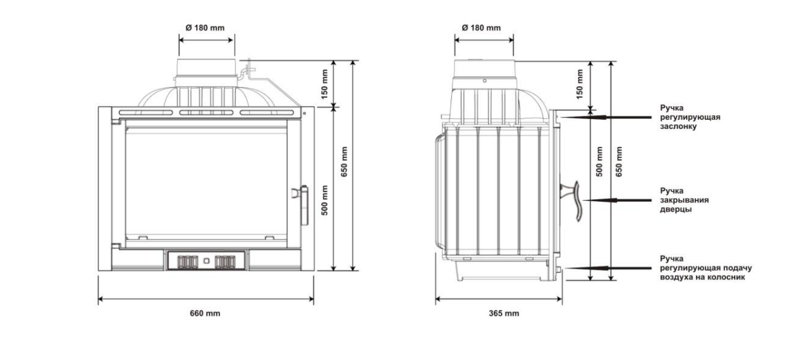 Топка предназначена для обогрева закрытого помещения. Тепло передается через огнеупорное стекло и через литые чугунные части топки. Детали топки изготовлены из чугуна, на топочной дверце размещено огнеупорное стекло.