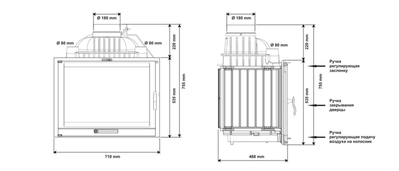 Топка предназначена для обогрева закрытого помещения. Тепло передается через огнеупорное стекло и через литые чугунные части топки. Детали топки изготовлены из чугуна, на топочной дверце размещено огнеупорное стекло.