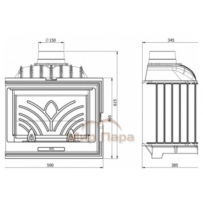 - Еще одна одна особенность это выход дымохода диаметром 150 мм, что даёт возможность монтажа топки в зауженный дымоход.