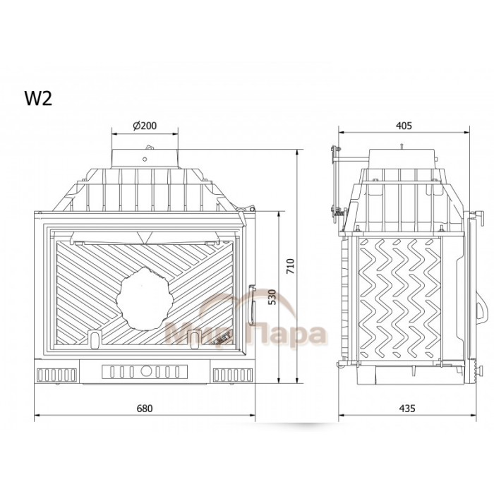 Классическая каминная топка W2 (14,4 кВт) это топка W1 с уменьшенной мощностью, используется для отопления помещений как качественный дизайнерский отопительный прибор, а также как предмет интерьера. Каминная топка W2 (14,4 кВт) является классической топкой премиум класса производимой заводом KAWMET многие годы, топка выполнена из толстого чугуна класса EN-GJL-200 и оборудована подводом наружного воздуха в камеру сгорания, встроенным шибером для регулировки процесса горения и дымоотведения, и более точной регулировкой подачи воздуха через нижнюю часть дверцы под колосниковую решетку, открыв ее на максимум, вы подаете к дровам оптимальное количество воздуха для быстрого розжига. В дополнение на рамке топки устроены конвекционные отверстия. Благодаря этим отверстиям воздух постоянно проникает в короб камина и конвекция происходит гораздо быстрее.