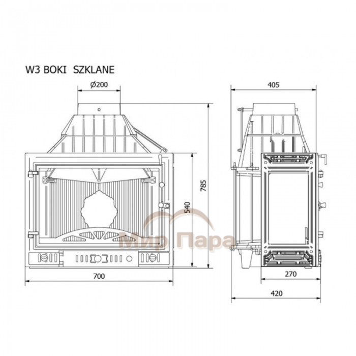 Классическая боковая каминная топка W3PB (16,7 кВт) с дополнительным стеклом для наслаждения игрой живого укрощенного огня с нескольких сторон, используется для отопления помещений как качественный дизайнерский отопительный прибор, а также как предмет интерьера. Жаростойкая плита в задней части топки декорирована гербом со львом.