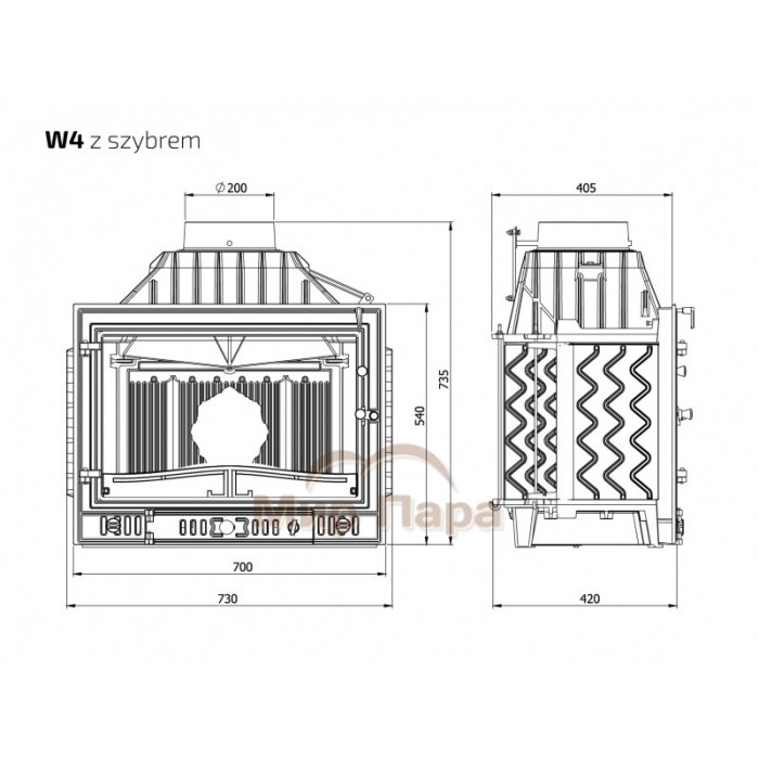 Каминная топка W4 (14,5 кВт) является классической топкой производимой заводом KAWMET многие годы, топка выполнена из толстого чугуна класса EN-GJL- 200 и оборудована подводом наружного воздуха в камеру сгорания, встроенным шибером для регулировки процесса горения и дымоотведения, более точной регулировкой подачи воздуха через нижнюю часть дверцы под колосниковую решетку, открыв ее на максимум, вы подаете к дровам оптимальное количество воздуха для быстрого розжига.