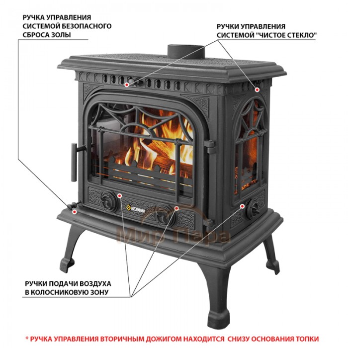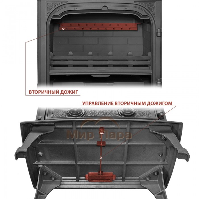Патрубок дымохода выполнен универсальным – его можно установить как сверху, так и сзади, что упрощает привязку печи к существующему дымоходу и дает больше свободы при выборе места установки. В конструкции предусмотрена система вторичного дожига: нагретый вторичный воздух по каналам подается в верхнюю часть топки, смешивается с горючими газами и вызывает их повторное возгорание, повышая КПД и снижая количество несгоревших выбросов; управление дожигом осуществляется отдельным рычагом в нижней части печи.