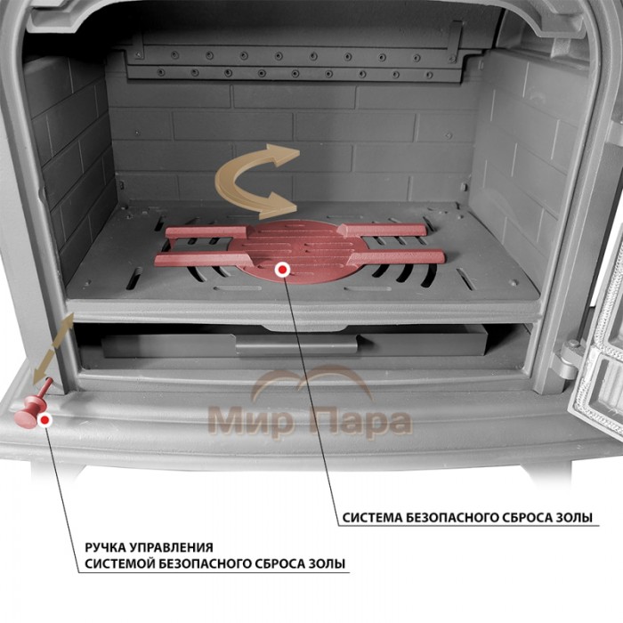 В нижней части дверцы находятся две удобные ручки для регулировки подачи воздуха в колосниковую зону, что дает возможность точно настраивать интенсивность горения в зависимости от погоды и желаемой температуры. В основании предусмотрена колосниковая решетка с приводом от вынесенной на корпус ручки: вы можете безопасно встряхнуть колосник и сбросить золу в зольный ящик, не открывая топочную камеру и не поднимая пыль.