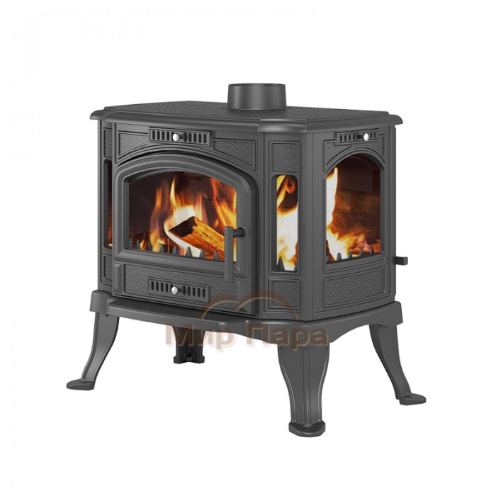 Большая арочная дверь из чугуна с панорамным стеклом и боковыми стеклянными вставками открывает широкий обзор огня и делает печь ярким акцентом в интерьере. Система подачи воздуха на внутреннюю сторону стекла формирует «воздушную завесу», которая отсекает дым и языки пламени, помогая стеклу дольше оставаться чистым и прозрачным. Ручка управления этой системой у модели KZ-14Р вынесена сбоку, над боковым стеклом, что удобно при эксплуатации.