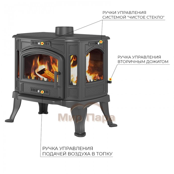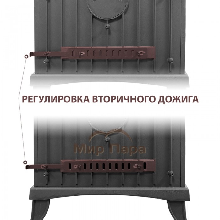 Вторичный дожиг реализован за счет двойной задней стенки: между корпусом и внутренней чугунной облицовкой образован канал, по которому из поддувала подается воздух в верхнюю часть топки, в зону активного горения. Нагретый воздух усиливает дожиг пиролизных газов, повышая КПД и снижая количество несгоревших продуктов горения; управление системой осуществляется заслонкой на задней стенке, ручка которой выведена вправо.