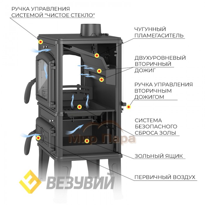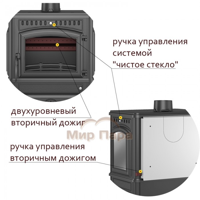 Топка печи-камина усилена чугунными вставками с системой вторичного дожига. С помощью этой функции по каналам подачи вторичного воздуха поступает кислород, который нагревается при прохождении между топочной камерой и стенками корпуса. Далее нагретый воздух через дефлектор поступает в топку, перемешивается с газами - продуктами горения, чем вызывает повторное возгорание. Регулировка этой системы осуществляется рычагом, расположенным справа на тыльной стороне печи-камина. Над дверцей печи-камина расположена система чистое стекло, которая помогает оставаться стеклу чистым. В нижней части печи на дверце зольного ящика расположена ручка для регулировки подачи воздуха в колосниковую зону, которая помогает контролировать интенсивность горения. В нижней части топки предусмотрена колосниковая решетка, которую можно привести в движение с помощью ручки, которая выведена справа на корпус печи. За счет этой функции появилась возможность безопасно сбрасывать золу в зольный ящик.