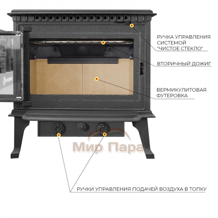 - Топка спроектирована для работы на дровах, обеспечивает равномерный прогрев корпуса и устойчивую тягу при правильном подключении к дымоходу. Топочная камера футерована огнеупорным вермикулитом толщиной 30 мм.