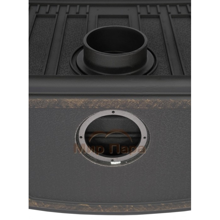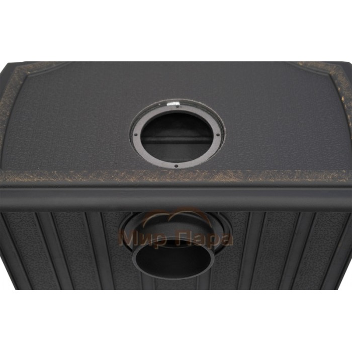 Чугунная печь-камин «Сибирь-10» оснащена универсальным патрубком дымохода, что позволяет осуществлять монтаж дымоходной трубы сверху, проходя через крышу, либо сзади, делая выход через стену.