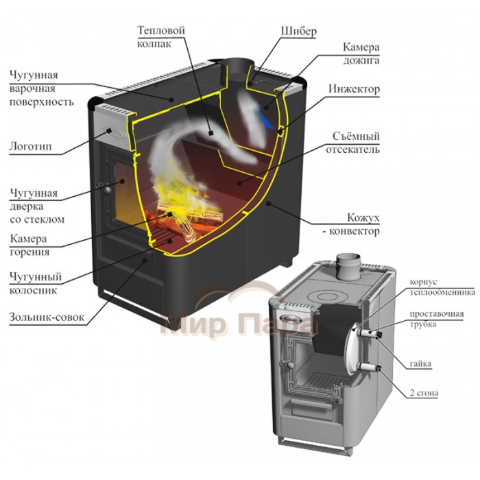 - Сложная система дымохода. Дополнительные отсекатели огня выполняет функцию оптимального распределения уходящих дымовых газов, исключая прямоток и обеспечивая полное сгорание топлива. Это повышает КПД и улучшает теплопередачу печи.