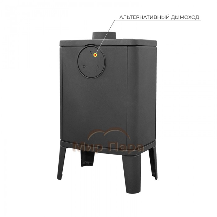 Чугунная дверца оснащена удобной ручкой с регулировкой силы прижатия, что улучшает герметичность топки. Дымоходный патрубок диаметром 120 мм выполнен в универсальном варианте: его можно установить как сверху, так и сзади, подстраивая печь-камин под планировку конкретного помещения.