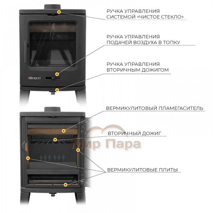 В топке использованы вермикулитовые плиты и пламегаситель, а также реализована система двухуровневого вторичного дожига: нагретый воздух подается по специальным каналам в зону факела, дожигает пиролизные газы и повышает эффективность сгорания. Регулировка подачи воздуха в колосниковую зону осуществляется заслонкой на дверце, а отдельная заслонка отвечает за работу системы вторичного дожига. Система «чистое стекло» с верхней подачей воздуха помогает сохранять смотровое окно прозрачным, отсекая сажу и копоть.