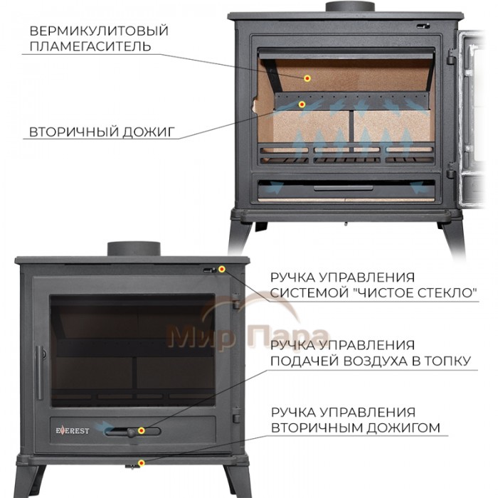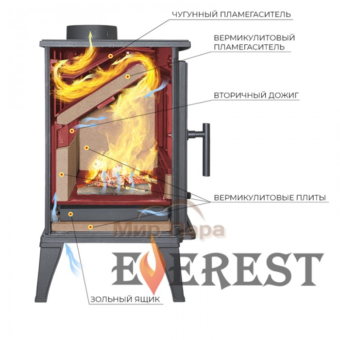 Вторичный дожиг и управление воздухом Everest М10 оснащена системой вторичного дожига: по специальному каналу воздух проходит между топочной камерой и задней стенкой корпуса, нагревается и через дефлектор подается в топку. Там он смешивается с продуктами горения и вызывает их повторное воспламенение, повышая эффективность и снижая количество дыма. Регулировка вторичного дожига осуществляется заслонкой в нижней части печи, а подача воздуха в колосниковую зону — отдельной заслонкой на дверце.