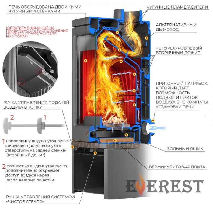 - В правой нижней части расположен регулятор системы «чистое стекло», направляющей поток воздуха вдоль внутренней поверхности стекла и препятствующей оседанию сажи. Печь работает на дровах и других твердых видах топлива, обеспечивая стабильное тепло и красивый вид пламени.
