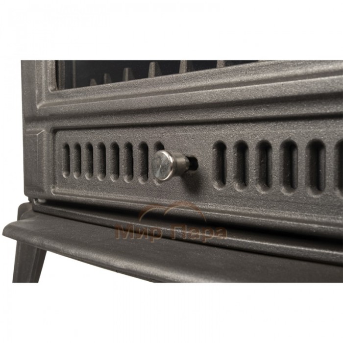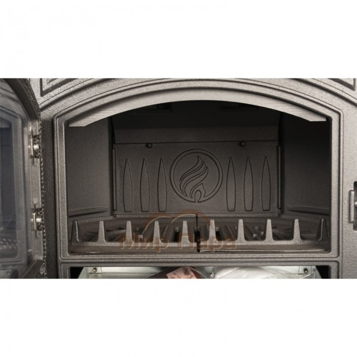 В нижней части печи, за общей дверцей размещен выносной ящик для золы. Прибор оснащен съемным колосником с гребнем, служащим ограничителем дров в топке. Изнутри топка защищена футеровкой и зубом из чугуна – печь имеет двойные стенки, на дне находится колосниковая решетка, под которой располагается зольный ящик.
