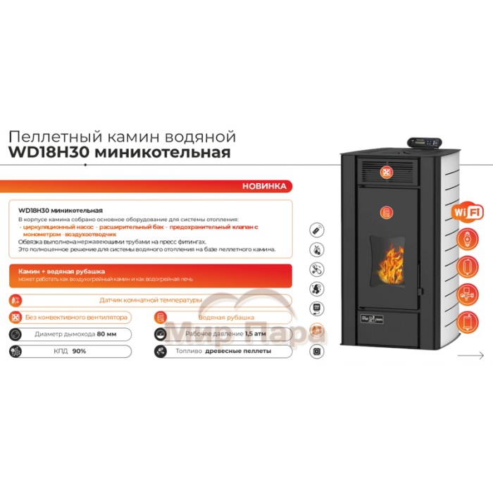 Описание Пеллетный камин ZOTA WD18H30 WI-FI с водяным контуром