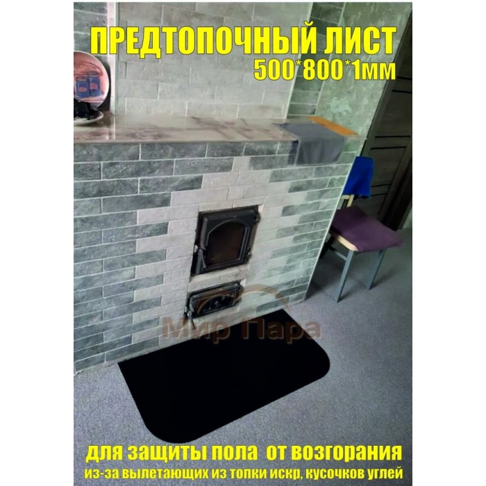 Предтопочный лист размером 500x800x1 мм производится в Республике Беларусь. Металлический лист предназначен для защиты поверхностей от возгорания и распространения огня в случае выпадения раскаленных частиц из топки печи или камина.