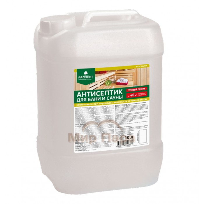 PROSEPT ECO SAUNA – антисептик на водной основе для бань и саун. Предназначен для защиты древесины от действия дереворазрушающих и деревоокрашивающих плесневых грибов в саунах, парных, моечных и прилегающих к ним помещениях. Содержит компонент, предотвращающий развитие болезнетворных микробов, спор грибков. Обеспечивает надежную защиту при циклическом увлажнении и перепадах температур.
