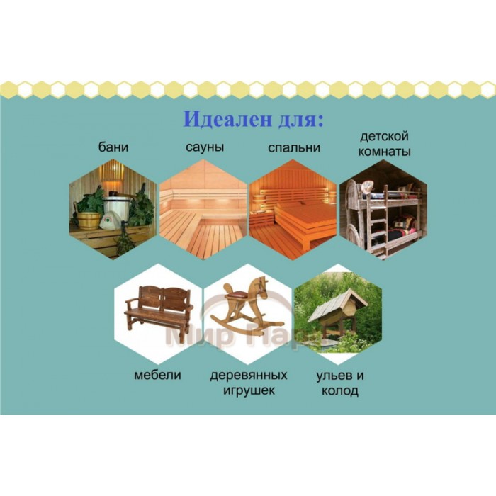 Область применения: баня, сауна, банные полки и полы, деревянные стены, потолки, интерьеры жилых помещений (кроме пола), деревянная посуда, деревянные игрушки, штукатурка, отделочный камень и др.