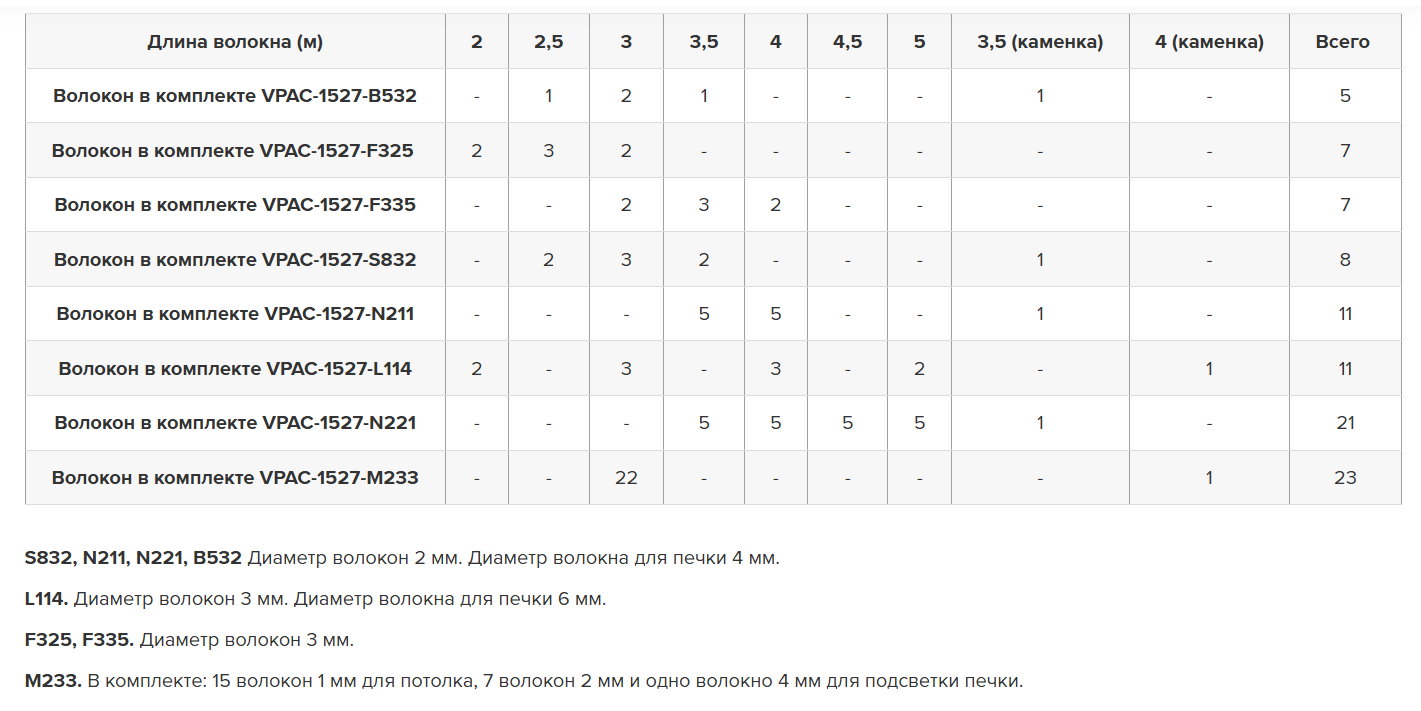 В набор входит все необходимое для монтажа: проектор, 7+1 волокно из стекловолокна, стопорные кольца и линза для подсветки печки. Волокна выдерживают температуру до 180°C, поэтому комплект подходит для использования в условиях высокой влажности и температуры.