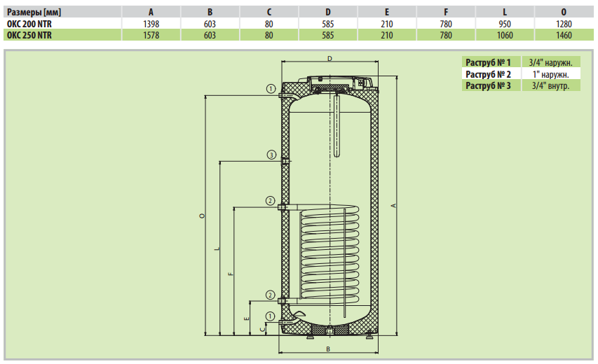 - Трубчатый спиральный теплообменник площадью 1,08 м² у модели OKC 100 NTR и моделей OKC 200-250 NTRR, 1,45 м² у моделей OKC 125-250 NTR.